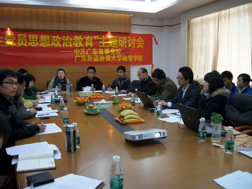 1月5日下午,我校政治与公共管理学院思想政治教育专业研究生与中共广东省委党校2010级研究生在南校区院系楼会议室举行学术研讨会,就“党员思想政治教育” 展开专题研讨,会议由学院办公室主任、研究生兼职辅导员刘湘英主持,省委党校研究生部副主任杨劲教授,政管学院院长彭未名、党委书记范静静,校党委组织部副部长、原政管学院党委副书记麦培年,以及来自两校的30名师生出席了研讨会。