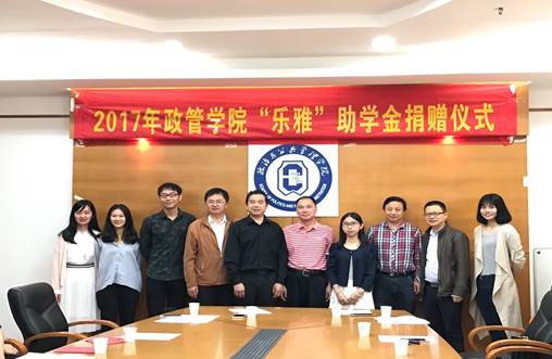 2017年4月28日上午9:00,在院系楼426举行了2017年政管学院乐雅助学金捐赠仪式。参加本次捐赠仪式的有院长彭未名、副院长毛国民、党委副书记邵兵、团委书记房瑞佳、辅导员白志华、陈胜老师。捐赠者有吴旭东先生和他的女儿吴雅婧以及政管学院的各届受助学生。