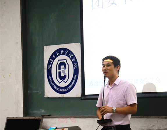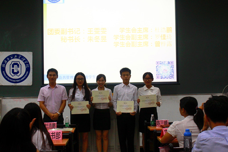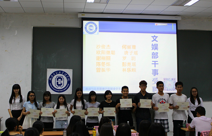 10月27日晚6点30分,广东外语外贸大学政治与公共管理学院第六届三任团委第八届三任学生会聘任大会暨第一次干事培训大会在教学楼E204室隆重举行。出席本次会议的嘉宾有:政治与公共管理学院团委书记陈三峰老师、政治与公共管理学院12、14年级辅导员房瑞佳老师、政治与公共管理学院主席团各成员及各部门正副部和干事。此处会议由学生会主席杜浩鹏主持。