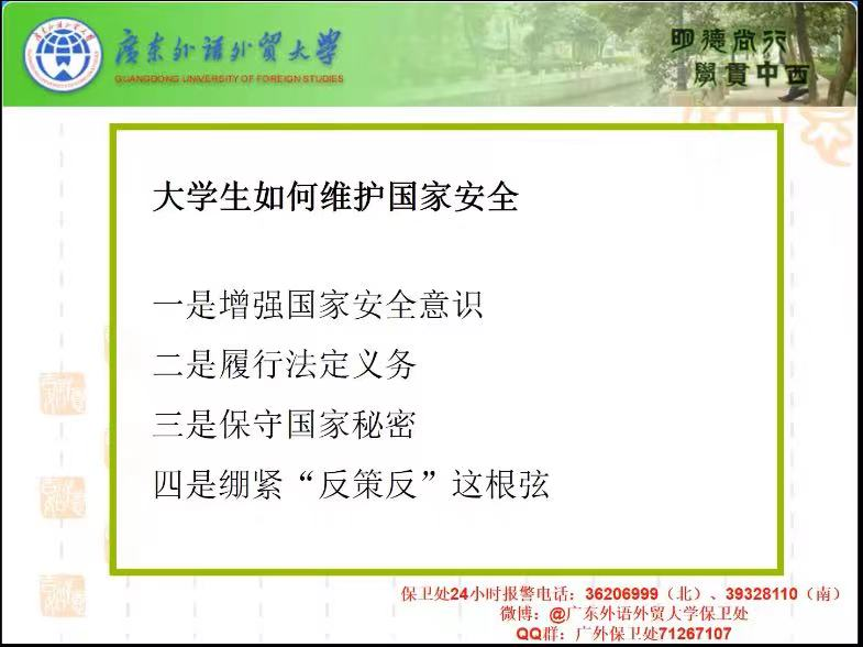 乔老师着重强调了以下两点:第一,国家安全的重要性以及作为大学生的我们应该怎样去维护国家安全;其次,她通过我校学生实际被骗案例,介绍了八个常见的诈骗手段和诈骗方式,以提高同学们的警惕性,最后乔老师给同学们提出一些应对措施,来帮助同学们识别和对应诈骗行为。
