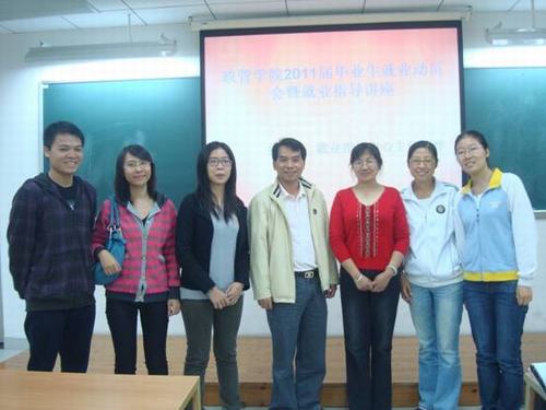11月22日晚上7:00,政治与公共管理学院在南校区E404教室举行了2011届本科毕业生就业动员会暨就业指导讲座,邀请了学校就业指导中心赵烨主任作了“就业形势与就业定位”的专题讲座。政管学院党委副书记麦培年、2011届毕业生辅导员梁玲华、教务员李洁、郭洪龙等出席了本次大会。本次动员大会旨在对2011届毕业生就业工作进行动员部署,帮助我院本科生了解当前就业形势,转变就业观念,提升同学们的择业技巧和就业能力。 赵烨首先和大家通报了我校2010年的本科生就业情况,以及当前广东省的整体就业形势,然后详细分析世界了500强的企业要求员工的具备11种能力,包括创造力、学习能力等。赵烨主任希望同学们明确自己的职业发展规划、要做好自身定位、发展自身能力、找准目标、树立正确的就业价值观、兼顾考虑职业兴趣和职业规划、积极作为、不要畏惧一时的困难,要勇于迈出第一步。 赵烨还就今年的就业政策、学校的就业工作安排、以及近年我院毕业生的供求状况和主要去向、面试技巧、网申、就业协议签订等同学们普遍关心的问题为同学做了详实的讲解和分析,就历年就业的成功案例与同学们进行了深入交流。赵主任的讲座主题鲜明、内容详实、语言生动、案例详细,帮助同学们打开了就业思路,掌握了解职业兴趣与职业能力的方法与途径,解决了有关就业、择业面临的困惑与问题,深深鼓舞同学们的就业的信心。