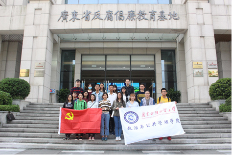 广东省反腐倡廉教育基地坐落于广州市番禺区番禺监狱旁,于2013年4月28日正式对外开放。基地以“反腐倡廉、警钟长鸣”为主题,一踏进大门口,映入眼帘的大厅正中央悬着一柄“利剑”模样的吊灯,以示“利剑高悬”,利剑下便是这庄严威武的八个字。在解说员的带领下,政管学院的师生们分别参观了“风正帆扬”、“从严治党”、“贪腐鉴录”、“拒腐防变”、“风清气正”五个展厅,各个展厅分别从历史和现实的角度剖析各大贪腐案例,又展示了广东省力行反腐倡廉的相关内容。