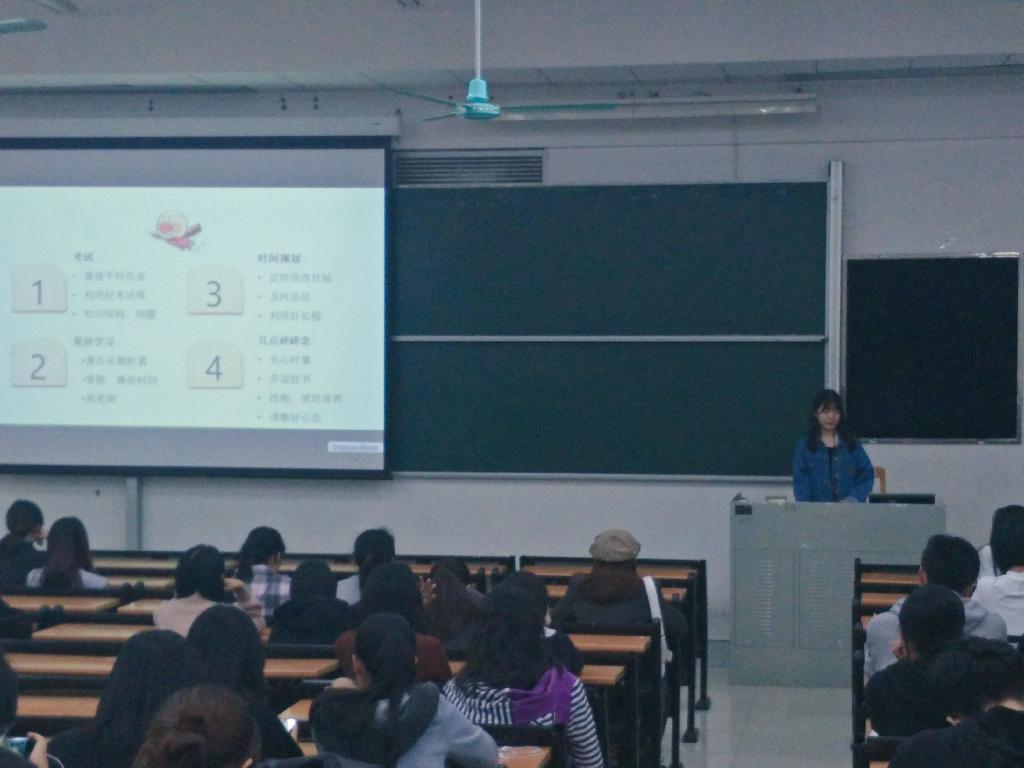 丁凯利同学首先向同学们展示了过去两年她的学习情况和课外经历,然后从四个方面向同学们介绍她的感悟。第一个方面是现状分析,第二个是自我提问,第三个是经验分享,第四个是暖心提示。在讲话中,丁凯利同学结合自己的经历向同学们分享了怎样处理好社团工作和学习上的矛盾,向同学们介绍了几种实用的方法,也推荐了几款实用的软件。然后,温馨提示同学们不要熬夜,照顾好身体,要珍惜时间,珍惜大一大二的美好时光。最后,祝愿同学们有一段美好充实的大学生活。