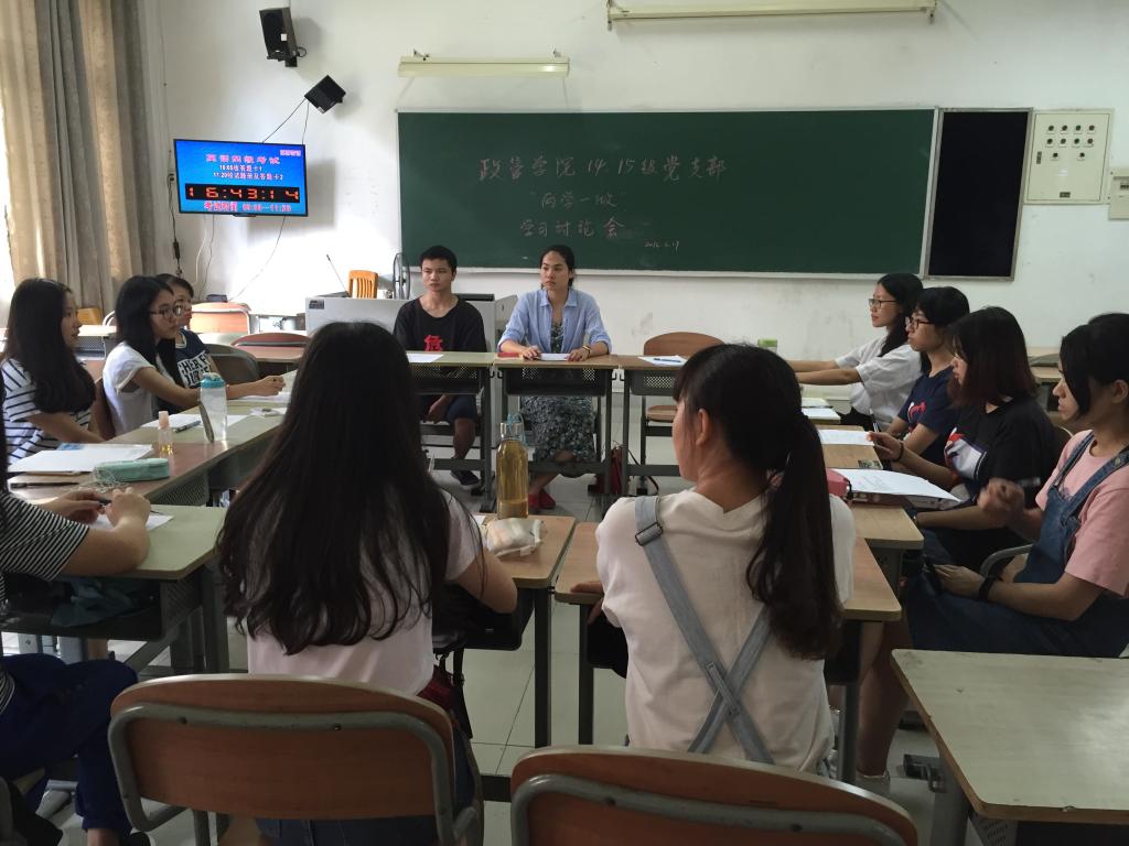 响应党和国家号召,为加强思想建设,积极推进和学习“两学一做”教育活动。6月17日下午,政管学院2014、2015级学生党支部在F103教室开展了“两学一做”学习讨论会。本次活动由党支部书记房瑞佳和陈咏莹主持,所有党员和各班党小组负责人出席了活动。