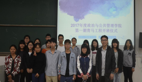2017年3月23日下午3:00,政管学院青马班开班仪式在南教学楼C507正式举行。本次开班仪式有幸邀请到了校团委龙飘飘老师、政管学院辅导员白志华,以及14级行政管理(涉外公共关系)的国家奖学金获得者邓慧敏同学,台湾义守大学交换生周盈同学和美国哥伦比亚大学交换生骆紫妍同学担任嘉宾。现场几乎座无虚席,同学都表现出积极热情的态度,期待着青马班的开班仪式。