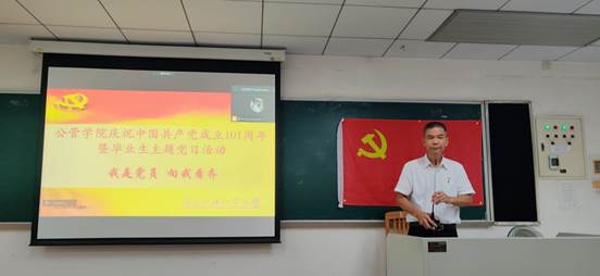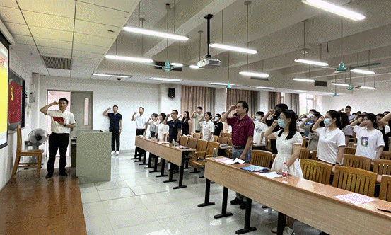首先,高书记表示,在中国共产党成立101周年华诞来临之际、在全体毕业班党员即将离开母校之际,我们在此隆重集会,庆祝党的生日和给毕业班党员上最后一次党课,显得特别有意义。他向与会成员介绍了到场嘉宾,并宣布大会开始。在全体成员奏唱完庄严的国歌后,陈哲副书记带领毕业班预备党员进行了入党宣誓、带领党员重温了入党誓词。
