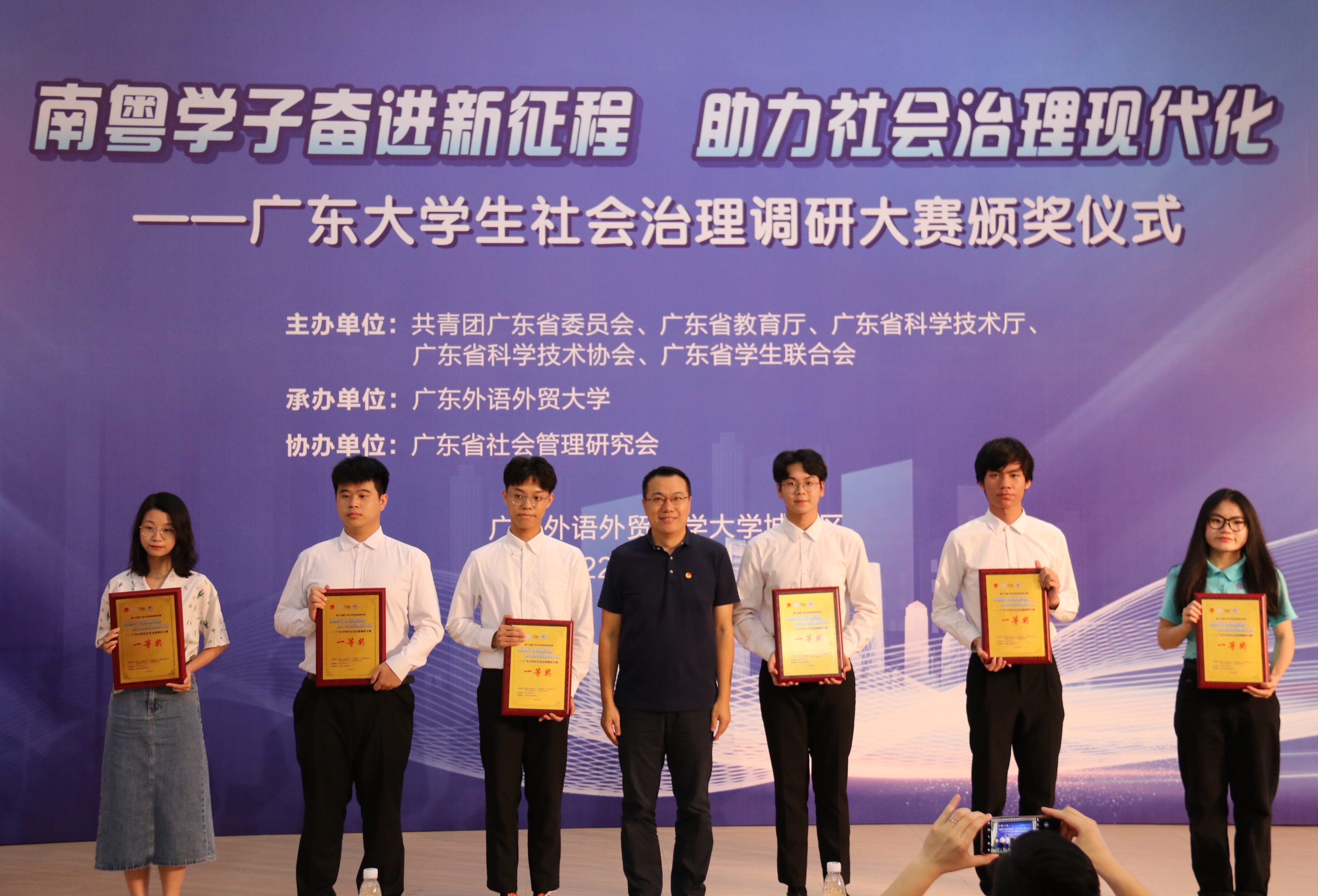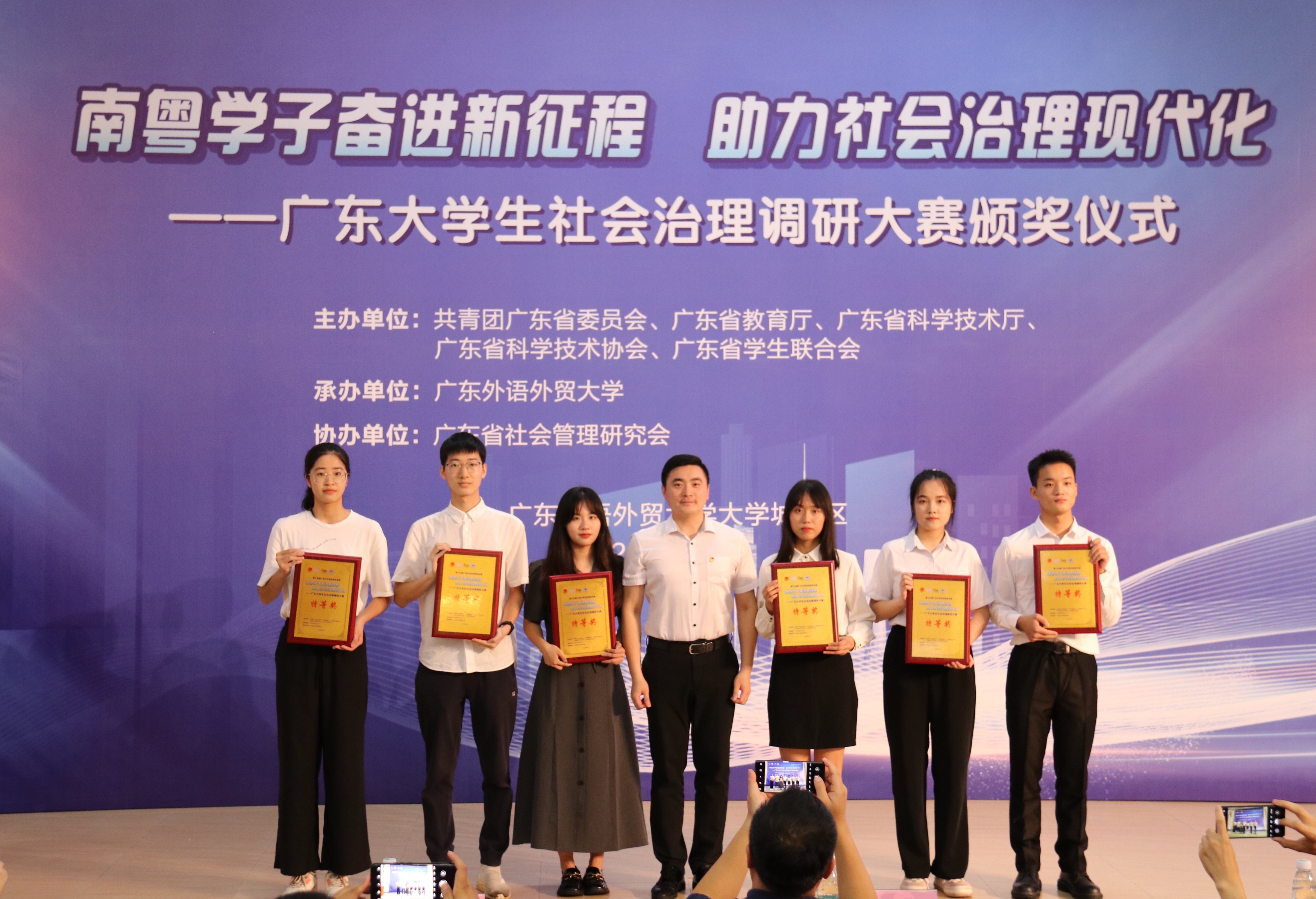 7月3日,广东大学生社会治理调研大赛决赛颁奖仪式在我校大学城校区成功举行。此次大赛由共青团广东省委员会、广东省教育厅、广东省科学技术厅、广东省科学技术协会与广东省学生联合会主办,广东外语外贸大学承办,广东省社会管理研究会协办。大赛组委会成员、共青团广东省委学校部副部长陈宇鹏,大赛组委会成员、广东外语外贸大学党委委员、校团委书记纪彬,大赛组委会成员、广外社会与公共管理学院党委书记高云坚等及获奖队伍代表出席了此次颁奖仪式。颁奖仪式由高云坚主持,采用线上线下同步直播的方式进行。