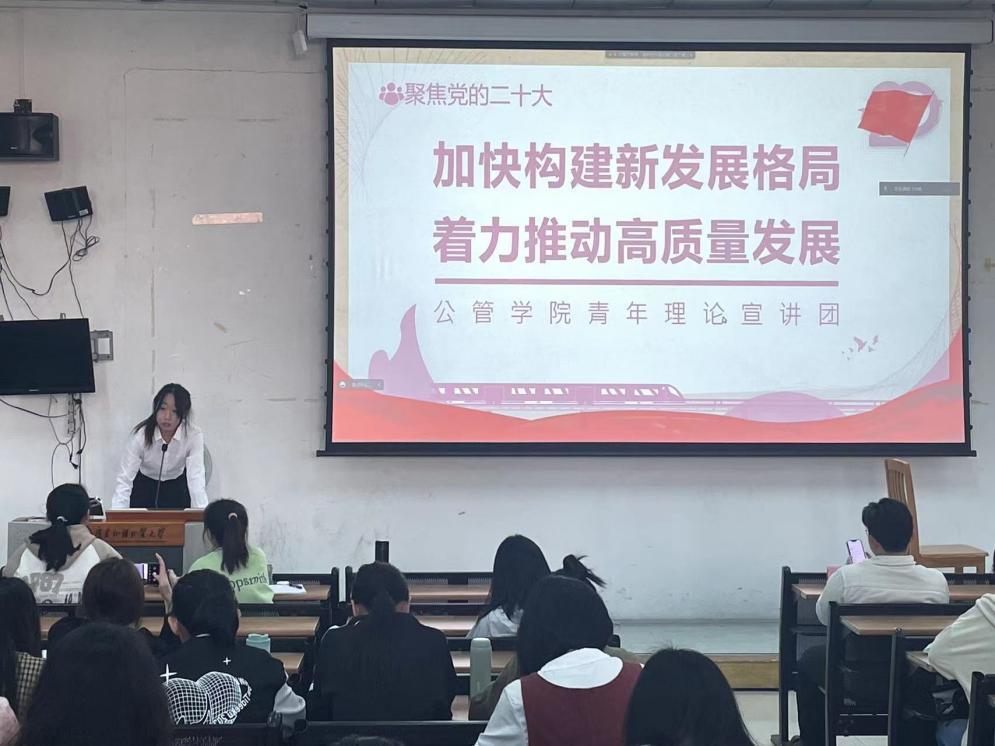 据悉,社会与公共管理学院为深入落实学校党委对学习宣传贯彻党的二十大精神的全面部署,扎实做好党的二十大精神专题宣讲工作,成立学院新时代青年师生理论宣讲团,宣讲团成员覆盖了公管学院研究生与本科生,包含刘金彩、方永曦、唐炎桂、张浩、张立宇、汤扬扬、卜欢欢、李元媛、付文会、冼良燕等学生党员。公管学院将持续开展党的二十大精神系列宣讲活动,扎实推动党的二十大精神学习宣讲教育进支部、进班级、进课堂、进宿舍、进学生社团、进学生活动,实现党的二十大精神在全院学习宣讲全覆盖。