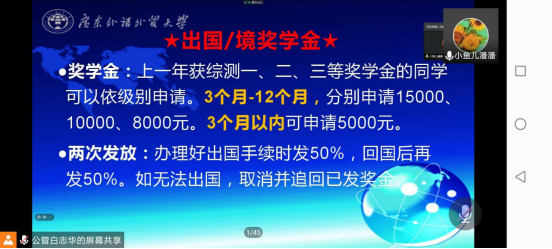 首先,党委副书记潘相宇分别从疫情期间学校防控要求及相关校规校纪、学生以及家长重点关注的内容,如学习成绩、奖学金、助学金、学生活动、校规校纪、双学位、升学深造、推免项目、心理健康教育等进行生动详细地讲解,及时解答了学生及家长的入校前的困惑,从而对学校、学院的人才培养模式、教学理念、大学里应该如何学习和生活有了更深一步的认识和了解,同时消除了新生入学前的顾虑,让他们对广外放心,对学院领导老师放心。