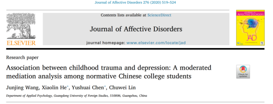 近日,由公管学院应用心理学系系主任王俊静副教授和陈宇帅老师共同指导的2019级应用心理专业硕士研究生何晓琳和林楚伟同学的论文《Association between childhood trauma and depression: A moderatedmediation analysis among normative Chinese college students》在SCI&SSCI收录期刊《Journal of Affective Disorders》在线发表。《Journal of Affective Disorders》是精神病领域的顶级期刊,最新影响因子3.892。该文第一作者为王俊静,通讯作者为何晓琳和陈宇帅。据悉,这是我院研究生以第一作者或通讯作者发表的首篇SCI&SSCI论文。