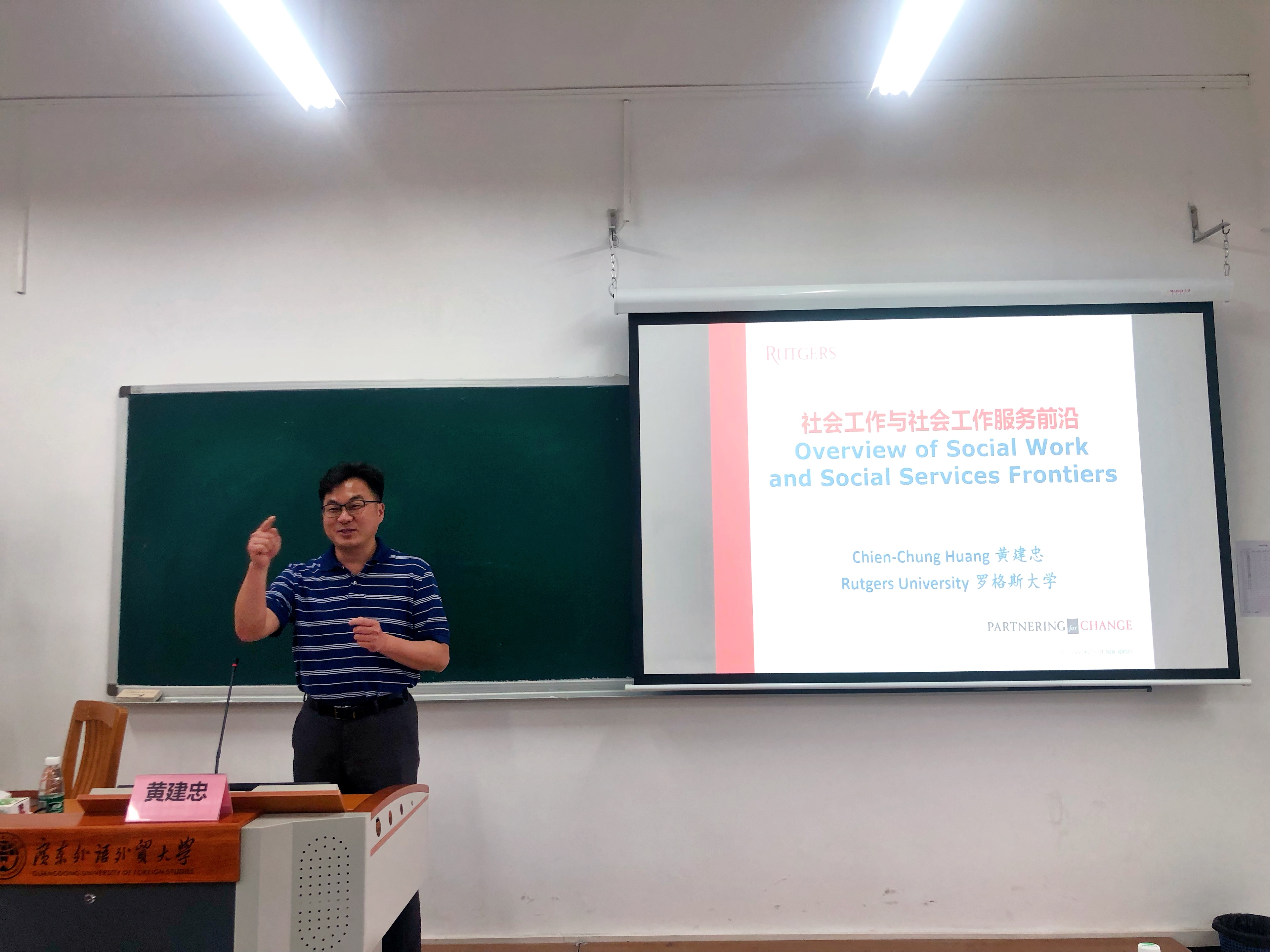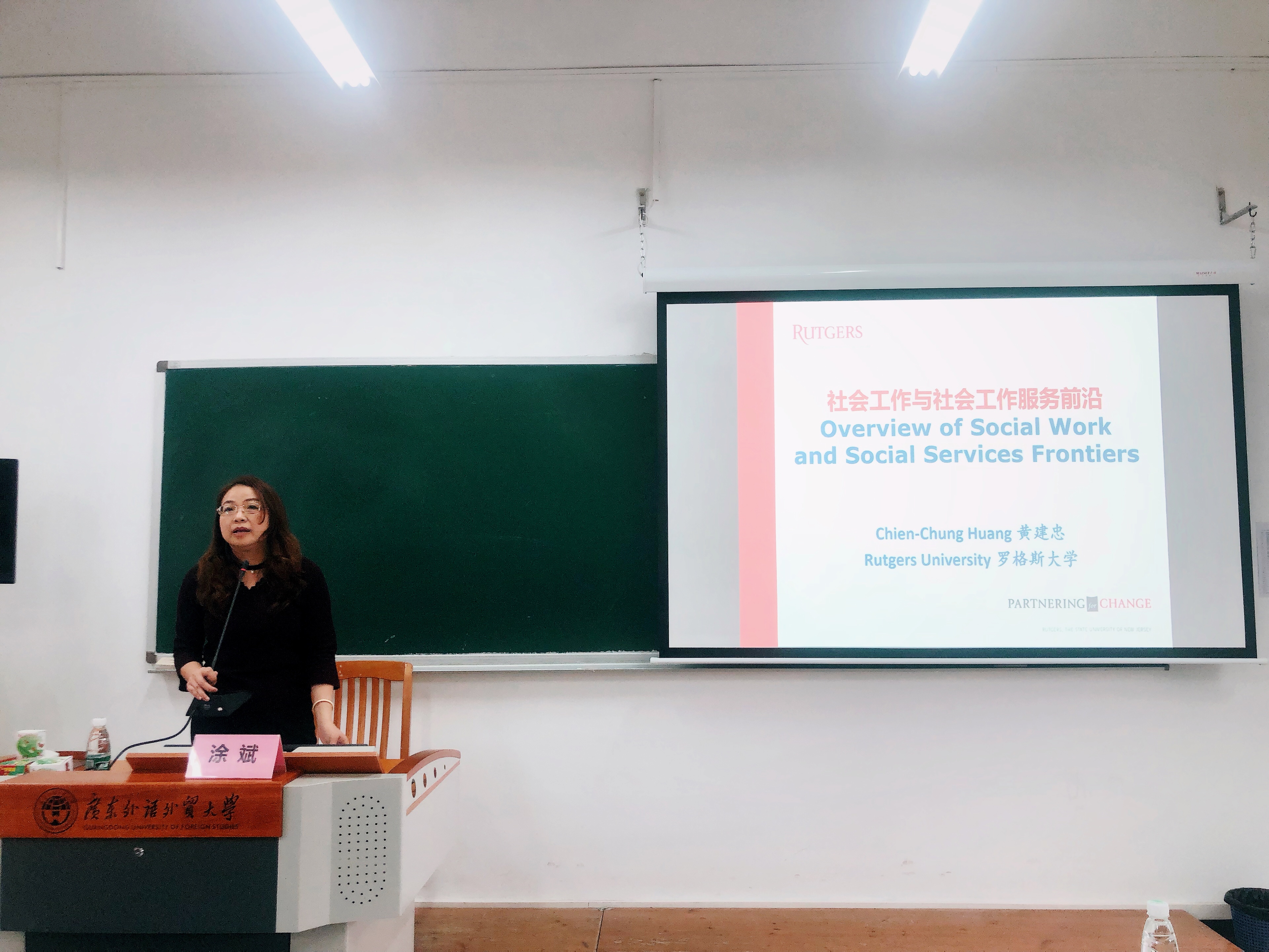 本网讯 为深化社会工作专业内涵建设,全面提升人才培养质量,4月19日下午,公管学院特邀美国罗格斯大学社会工作学院黄建忠教授在大学城校区教学楼D508开展主题为“社会工作与社会工作服务前沿”的线下讲座。公管学院院长涂斌、五级组织员高云坚、广东社会组织管理学院副院长陈胜、公管学院副院长费久浩和部分师生参加了本次讲座。讲座由涂斌院长主持。