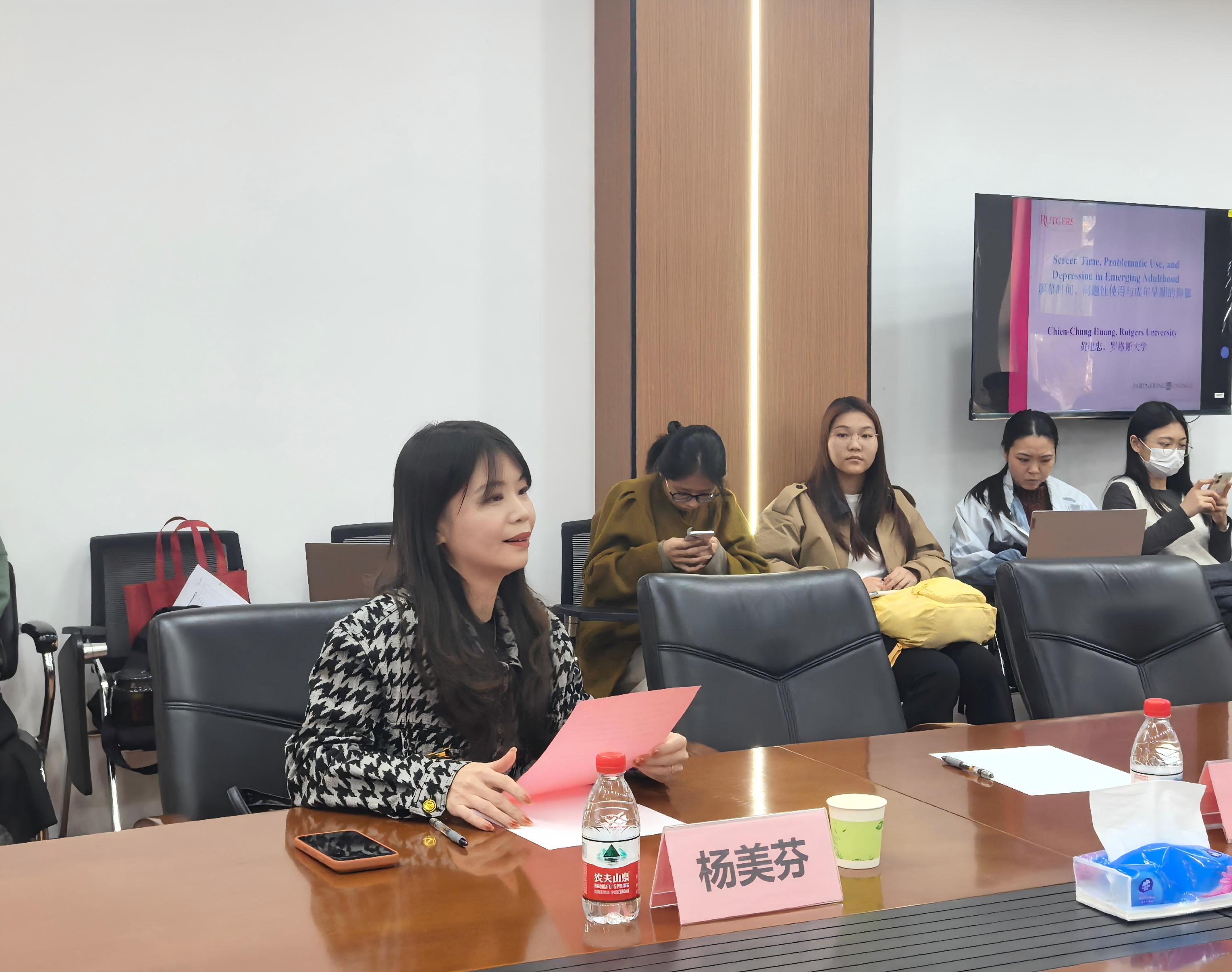 在互动讨论环节,在座研究生纷纷提出与该研究相关的专业问题,例如长时间使用手机导致抑郁的影响因素是网络游戏还是在线工作、社会参与与受教育程度是否影响手机使用时长等,黄教师均耐心地解答。最后,杨美芬老师对本次讲座进行了总结,并对黄教授的宝贵分享表示了衷心的感谢。此次讲座让与会师生对手机使用、责任心与抑郁的关系有了更深入的了解,也为高校师生提供了降低抑郁症风险的实用建议。