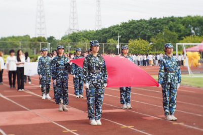 开幕式中,国旗班以整齐划一的脚步入场,他们神情肃穆,鲜艳的五星红旗在阳光下熠熠生辉。紧随其后的是院旗方阵,承载着两个学院的精神与荣耀,他们踏着矫健的步伐走向主席台中间,展现青年风貌。