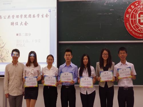 在经历了长达一个月的考察期后,政管团学终于迎来了新干事们正式加入团学的日子。2012年11月10日上午9点,政管学院第六届一任团委第八届一任学生会聘任大会在F315顺利召开。团委书记陈三峰老师、主席团成员以及各部门的部长等出席了大会,大会由团委副书记余磊主持。