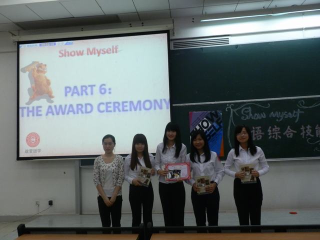 第六届英语综合技能大赛在最后的颁奖仪式中圆满结束,虽然只有在2个小时,但是所有的人都花了很久的时间准备,而她们的付出也终究有了回报,她们Show出了风采,show出了激情!