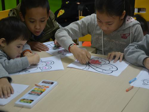 随后,老师给小朋友们派发了纸笔,让他们做手工绘图并将学到的单词用到手工绘图中。