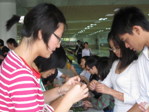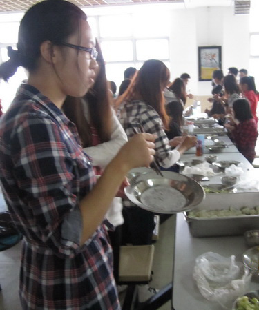 整个团学一共分为五组,每组几乎全由不同的部门成员组成,这更能增进整个团学的感情,提高凝聚力。现在已有几盘馅“露出了庐山真面目”,每组有三种不同的馅。材料尚未完全准备好,大家便按捺不住那股兴奋了,纷纷对着那仅捧出的馅“望穿秋水”。