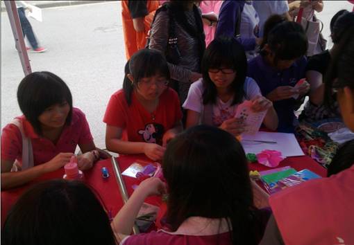 在下午的活动中,我院青年志愿者协会设立了“DIY手工坊”摊位。通过对志愿者的预招募和现场招募,让广大同学成为志愿服务的主角,由我院青年志愿者协会的工作人员对志愿者们进行培训,教授他们做各种手工,不久就诞生了一支优秀的临时志愿者队伍。接着由临时志愿者自己动手制作工艺品,并招揽其他同学参与其中,现场教学。精美的手绳,栩栩如生的玫瑰花,吸引了一波又一波的的人潮。志愿者们热心的服务和耐心的讲解赢得了同学们一致的好评。全场情绪高涨,欢笑不断,尽管天色渐晚,但人群依然有增无减,气氛十分热烈。