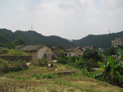 洛洞村位于比较边远的山区地带,抗战时是重要的革命根据地,并于93年被省政府授予革命老区的称号。我们怀着好奇和敬仰,浩浩荡荡地踏上了洛洞村访谈的坎坷征途.山路十八弯,公共汽车自然成为一种奢望.在万般无奈之下,我们只能搭乘当地所谓的“小四轮”(小型面包车)。小四轮摇摇晃晃爬坡而上,告别了平坦的水泥路后,等待着我们的是出乎想像的崎岖之路,而山路两旁却是深不见底的山沟.素来以巾帼不让须眉自诩的调研组女生们终于遇到“克星”,都吓到“魂飞魄散”。时间在颠簸中悄然远逝,眼前也豁然开朗起来了。广袤肥沃的谷地,风味独特的客家土屋,一切都那么似曾相识。正是稻收时节,处处是稻花香里说丰年,听取“笑声”一片。