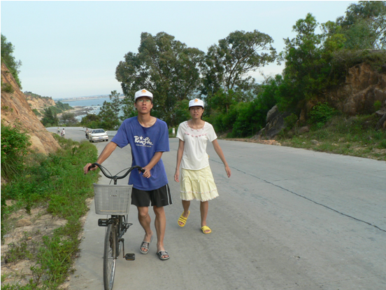 从我们的驻足地到海边,大概需要40几分钟的车程。骑上单车,带上帽子,顶着下午的太阳,我们一行14个人,浩浩荡荡的在街头巷尾穿行。由于人数比较多,只能两个人合用一台车。在路上,前面 载人的挥洒着汗水,后面被载的观察前后队员的情况。所有人合作无间,不会让一个落下。路婉转曲长,时而上坡,时而转成泥泞地,队员们只好徒步行走,但是这个完全没有难到我们。