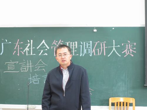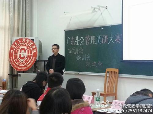 为加深学生对广东社会管理调研大赛相关内容及调研知识的了解,政管团学调研部于2012年11月29日下午举办了广东社会管理调研大赛培训会宣讲会暨交流会,并很荣幸地邀请到邵兵书记、陈三峰老师、陈胜老师担任嘉宾以及第六届调研大赛一等奖队伍队长曾泽亮师兄、第五届调研大赛二等奖队伍队长刘少燕师姐进行经验交流。