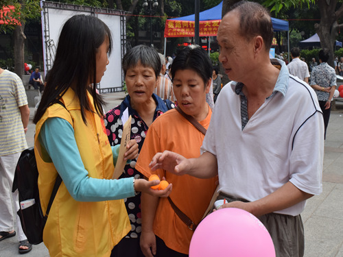 参加本次活动广外社协的义工队的志愿者们一大早便来到了活动现场,他们透着一份敬业,从一桌一椅的搬运排放到一横幅一艾条的准备齐全,每一个完美就绪都在汗珠滑落间不经意地配合完成。沐浴着日光的志愿者们却氤氲着一股众志成城的气势。该活动的相关负责人,见到大家能够这么团结服务大众也感到很放心。
