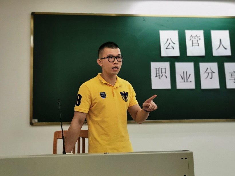 大会伊始,房瑞佳老师向大家隆重介绍了职业分享会的嘉宾袁振杰、钟绮雯。袁振杰于2016年毕业于行政管理专业,目前是中国银行的一线理财经理。钟绮雯于2016年毕业于行政管理专业,目前是中国银行的二线文秘工作人员。