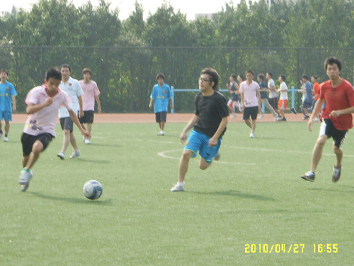 4月27日下午4点半,07应心和09应心的两支球队在足球场上进行了一番默契和球技的比拼,场面热闹非凡。即便是当空的烈日,也无法影响到他们一比高低的决心。 上半场比赛一开始,09应心立刻抢夺到球的主控权,冲过对方的防守线,转身射球。07应心守门员巧妙地接下这惊险的一球,逆转了紧张的局势。07应心不由加紧了对09应心的防守力度,利用控球的主动权也层层逼近09应心的防线,不料被09应心接下了这一球。两队互不相让,07应心的进攻频频被09应心抢断,09应心的突进也被07应心的防守挫败。在上半场的后半段,07应心失误犯规,让09应心赢得一次点球机会。在全场的注目下,09应心起脚射门。07守门员正欲拦住时,球却碰到杆飞离了球门。09应心不幸错失一球。直至上半场结束尚未有一球得进。两支队伍在赛场上针锋相对,两方的啦啦队也在场下毫不示弱地呐喊助威,加油喝彩。场面一片欢腾。
