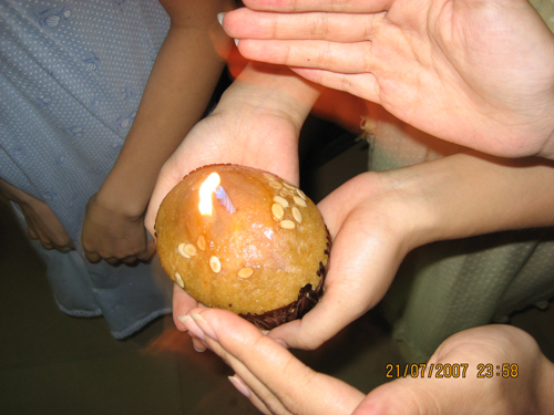 在我们无意中得知他的生日日期之后,大家商量着给他一个惊喜,在三下乡铭记这一刻。所以就偷偷跑到市集上买了一个蛋糕。在晚上0时0分的时候,我们把灯全部关掉,用一支蜡烛插在蛋糕里面,为他唱起了生日歌。为他送上祝福。他被我们的歌声吵醒了,用手柔了柔朦胧的双眼,惊讶地瞪着大眼睛盯着我们看。看着充满笑容和祝福的我们,他的眼中闪着泪光,但是强忍着没有让他流下来。突然,他转过身去,再次用手柔了柔双眼,明显地他不想让我们看见他泪洒大众的场面。在那只被风扇吹得勿明勿暗的蜡烛面前,他郑重地许下了他的愿望。然后,有点哽咽地说:“这次我要把我的生日愿望跟大家分享,我希望晨光舰队的全体队员以后都顺利、健康、幸福。而且我相信这个愿望会为我、为大家而实现。感激我遇见大家!!”说完之后,又是把头往里面甩。之后,副队长魔术般地拿出一个鸡蛋,递到他的面前说:“以前我妈妈在我生日的时候都会给我一个鸡蛋,现在我就做一次妈妈吧!说完,戏剧性地拥抱在一起,一边抚摸着他的头一边说:“我的儿啊,又大一岁了,以后要听话哦。”紧接着又是一阵爆笑!