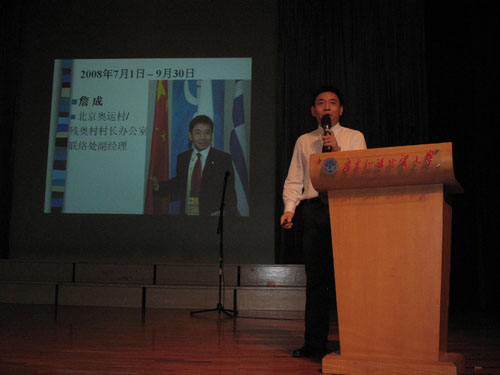 接下来是高级翻译学院詹成老师的关于北京奥运村礼宾工作的讲座。他向在座的同学介绍了北京的奥运村和残奥村,并讲述了他在奥运村的工作经历。报告厅内不时响起阵阵掌声,反映了同学们对詹成老师志愿服务的钦佩和赞许。