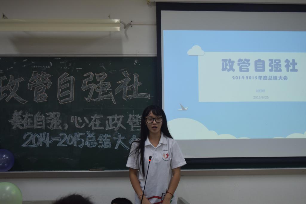 首先,政管自强社的指导老师房老师发表讲话,表示支持政管自强社的活动,同时给出对发展政管自强社的建议,期待政管自强社在新任干部的带领下越办越好。接着,刘舒婷社长总结这一学年社团的工作,表示对指导老师、社长团、社员等的衷心感谢,其中,社长提及的对社团工作开展的反省与期待,让新干部有所思考。