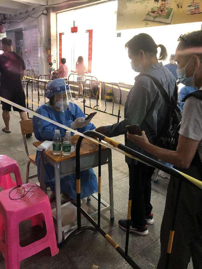陈苑洁同学积极参与海珠区瑞宝街道的疫情防控工作,她协助、指引核酸采样现场的社区居民进行扫码通行、体温检测以及其它相关工作,陈苑洁同学的志愿服务行为为瑞宝街道做好大规模核酸工作、筑牢抗击疫情防线增添了一份力量。