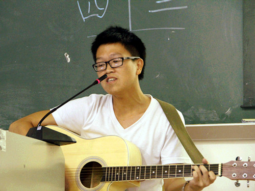 在重要的班级事务交代完毕后,林浩同学上台为大家表演吉他边弹边唱,为大家送上《彩虹》等几首抒情歌曲,同学们都陶醉不已。
