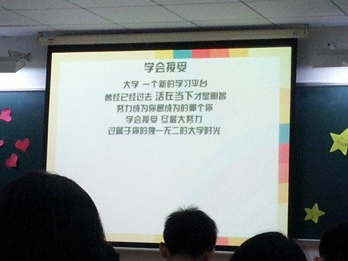第二个环节是师兄师姐讲述一些学习和生活上的经验,首先是班长马伟健给他们讲解班委的作用以及送上新学期的寄语,班委群对于一个班级来说,是很重要的组成部分,在演讲上,伟健师兄用简短的语言告诉了大家这个重要的道理。接着,池姗师姐给学弟学妹讲解大学的追求,池姗师姐用一番激动人心的话,想让新生们了解到大学能不能成长,需要靠自己的努力。接下来,上台讲话的是在创新班的卢翠玉师姐,她讲述了自己一年以来在创新班的感想,并且以实际的例子告诉在大学里要“我疑故我思,我思故我在”。后面还有几位师姐做了讲话,小星星们很认真地听着大星星们的教导,因为他们知道大星星们的无私的讲解知识为了让他们能了解更多道理。