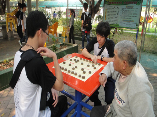 有一位“棋王”爷爷,跟我们下棋,甚至以一己之力应付我们4个同学也依然不落下风。“棋王”爷爷在下棋的时候,一步步地引导我们,在关键处还明确提示。虽然我们悔了很多次棋,但是老人家也毫不介意。一个下午并不能让我们的棋力飙升,但也让我认识到了天外有天,人外有人。老人家的耐心让我们十分感动。