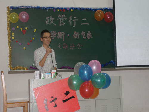 紧接着,辅导员陈三峰老师发表了讲话,他肯定了11行2在过去一个学期所取得成绩,并认为11行2是一个自由、积极、和谐的大家庭,同时,他也提出了一些希望,希望同学们可以积极参与社会实践,不断提高自己的实践能力,坚持自己的梦想,做最好的自己。