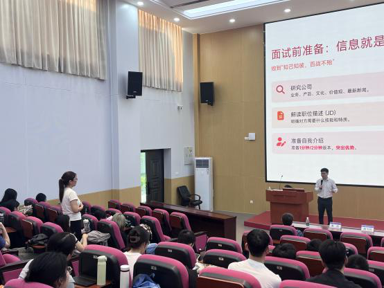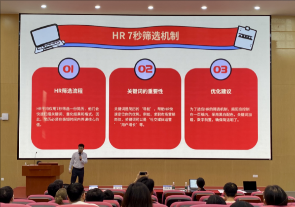 洪新华副总经理针对简历的制作、面试流程及评分纬度,用HR的视角讲解企业筛选机制。同时,他结合自身经历,指出学生可以根据自身兴趣、条件、优势,尽早规划,获取机会。
