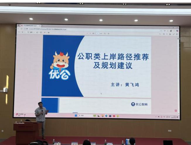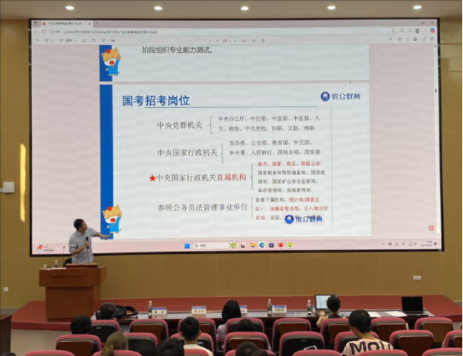 本网讯 为更好帮助毕业生提高就业竞争力,2025年9月18日下午,公管学院在大学城校区MPA中心第一会议室组织了“聚星成炬•职引未来”系列讲座之考公考编及简历制作指导专题讲座。广东优公教育校长,优公教育金牌讲师,广东外语外贸大学特邀校外导师黄飞鸿,我院硕士生校外导师、广州爱杰人力资源服务有限公司副总经理、资深顾问洪新华分别开讲。我院党委副书记刘丽玉、本科生辅导员黄浩、研究生辅导员李佳宁以及大三、大四、研二、研三的学生参会。