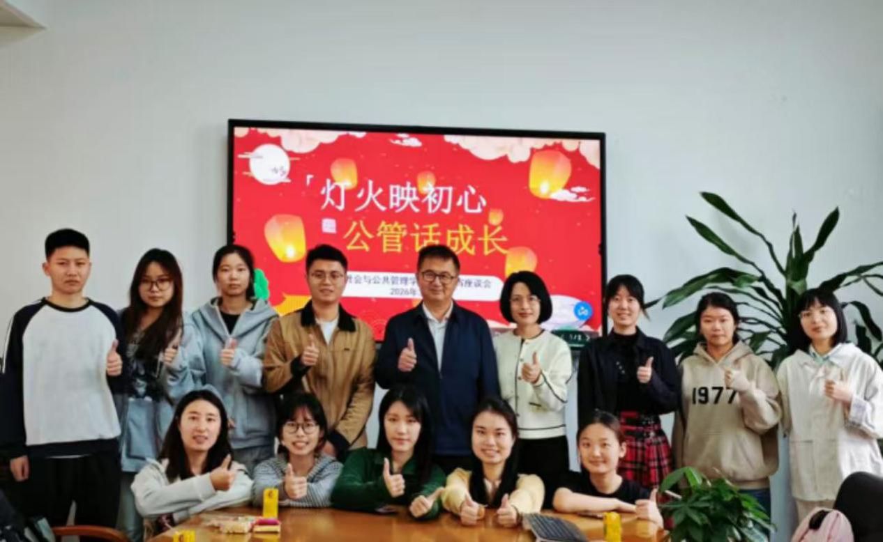本网讯 为切实做好新学期学生服务保障工作,精准掌握学生思想动态与返校适应情况,2026年3月3日,公管学院组织开展“灯火映初心,公管话成长”主题元宵节座谈会。学院党委书记邵兵、党委副书记刘丽玉,辅导员黄浩、李佳宁与来自不同年级、不同专业的十余位学生代表欢聚一堂,共庆元宵佳节、共话学业成长、共解成长困惑,搭建师生沟通桥梁。