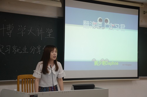 首先是姚少明同学的演讲,以“翻滚吧,实习君”作为演讲主题,以自身的实习经历为例,向大家讲述了注重自身特色、行知、尝试、选择和资源等职场道理,并且分享了CV简历和面试的一些经验,纠正了一些误区。
