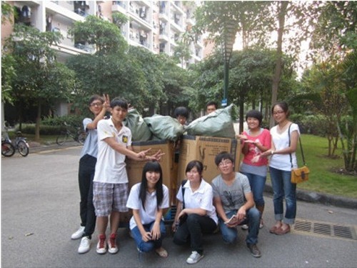 一年前第一次跟着师姐在石洞下集合,一年前第一次抢着“进攻”二楼三楼,一年前第一次拖着寒酸的麻包袋,一年前第一次小心翼翼地敲陌生宿舍的门,一年前第一次亢奋地毫不动摇举起胶樽,一年前第一次柔情似水地拖拽大号垃圾袋下楼,一年前第一次尾随当当巨响的拖车,然后快步向前,还有第一次晒黑到一种程度,在还没来得及变白的时候就心甘情愿地拍照……这些我都记得。那是去年的第一次,第一次爱心宿舍志愿回收。