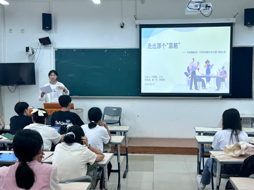 2024级新生陈萍作为小组代表汇报发言,该组聚焦于本书的内容逐章分析,为我们详细地介绍了书籍的基本架构。最后通过分析例句提出本组的见解即在探索大学生活的同时也应该思考自己的未来。