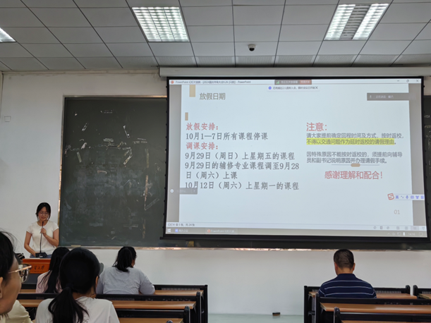 接着,级长吴佳慧为同学们讲解国庆假期安排的相关内容,深入讲解了国庆假期的放假时间、注意事项,为同学们的国庆假期安排提供了相关参考。