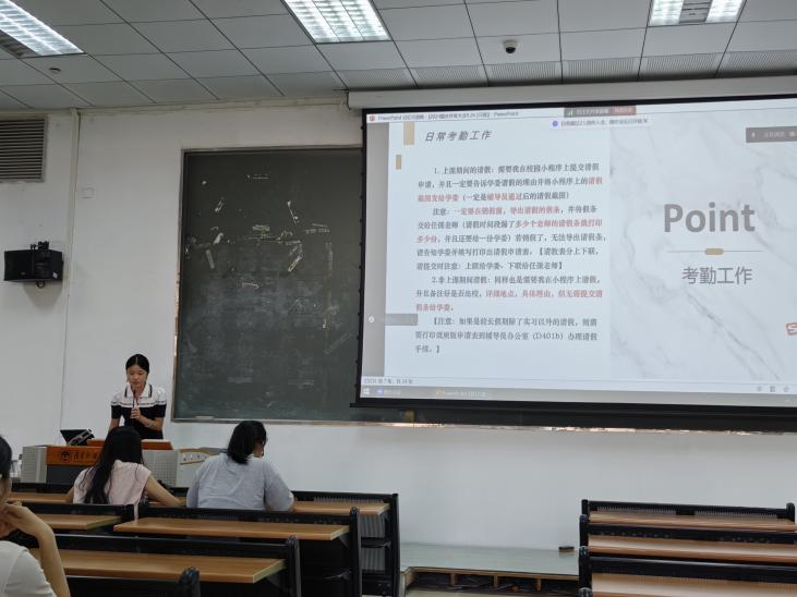 紧接着级委彭丹亭详细介绍了公管学院的考勤制度,通过分享请假不同时长的规则,告诉同学们请假的具体流程。接着讲解了学委的工作职责,呼吁大家遵循考勤制度,积极配合学委工作。