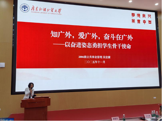 本网讯 为助力学生骨干明确使命担当、提升工作能力,2025年11月13日下午15:30,公管学院在MPA第一会议室举办“知广外,爱广外,奋斗在广外——以奋进之姿勇担学生骨干使命”专题讲座。本次讲座特邀学院2006 级优秀校友、广东财经大学学生工作部副部长吴宏豪主讲,学院党委副书记刘丽玉、辅导员黄浩、李佳宁及本科生、研究生各级学生骨干代表齐聚现场,共同聆听这场兼具温度与深度的成长分享。