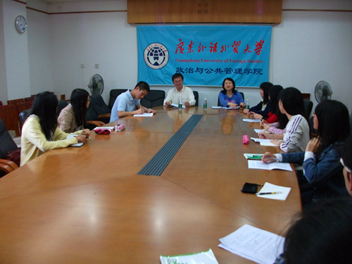 2012年4月20日下午3点30分,政管学院基层党组织布置暨总结会议在院系楼426顺利召开,政管学院党委书记范静静、党委副书记邵兵以及辅导员陈三峰等出席此次会议,与会人员还包括学生党建各部门部长和干事等。