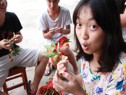 笑声一阵又一阵。当地的老师,很随意坐在我们旁边,有一句没一句地闲聊,大家都不像一开始那般拘谨。那边摘够了,捧着一大把跑到这边,龙眼往中间地面一放,加入大家的说笑,一只只手便伸向龙眼,开始一颗颗剥,露出嫩嫩的肉,滴着汁。纯天然生长起来的龙眼树,结的果子不比市场卖的那般圆润,却也很甜,有,很独特的乡间青草味道。