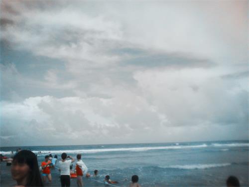 大约四十分钟后,我们终于到达了风景优美的月亮湾,还在远远的地方就看到高高的海水,闻到咸咸的海风,天空中大多大多棉花糖一样的浮云更是衬托得这次旅行更富诗意!停好自行车后,一群人尖叫着跑向大海、拥抱大海!
