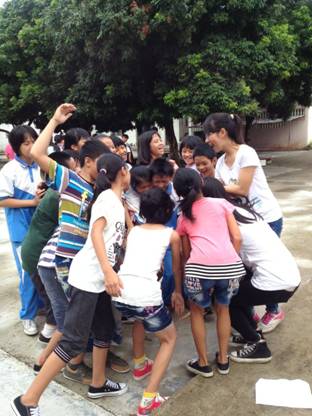 上午8:10,活动准时开始。欢乐校园活动设立了四个游戏:背气球,运乒乓球,欢乐弹跳和举起手来。我和另外一位队员带领第三组的孩子玩游戏。第一项为举起手来,一开始,孩子们并不解游戏规则,在举起手来传气球的过程中状况百出,最后一个孩子在挤破气球的时候也拿气球没辙,不管怎么样挤都挤不破,逗得我们大笑不已。第一次游戏用时比较长。后来,孩子们慢慢明确了游戏规则,掌握了游戏规律,传球速度明显快了很多。三轮游戏下来,我们的最少用时仅仅为11秒!这让孩子们信心大增,对接下来的三个游戏跃跃欲试。