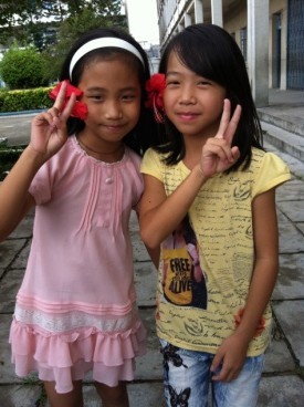 上体育课自由活动的时候,嘉敏小朋友和秋燕小朋友找我们玩,她们摘下了学校里的小红花送我们,把花插在我们的头上做装饰,拍照合影。嘉敏小朋友说,秋燕是她的好朋友,平时一起玩,一起放学,假期里,每周三,秋燕她们都会去嘉敏家里一起玩。看到两个小朋友一起玩,那么有默契,我们也感到很开心,我们也跟她们说,既然是好朋友,就要一直当好朋友下去哦。